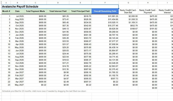 Once the Avalanche Payoff Schedule is fully calculated (all debts paid down to $0.00):