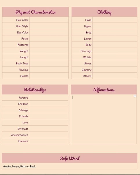 - Image placeholders – Insert visuals for appearance, outfits, or DR settings.