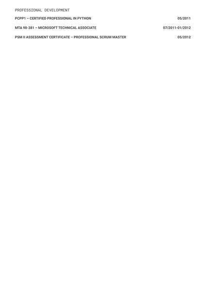 Sections include: Professional Summary, Software Development Experience, Technical Stack, Certifications, and Education