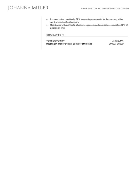 This Google Docs resume template is designed specifically for interior designers who need to present both creative range and professional experience in a polished, modern format. The layout supports portfolio-driven content while remaining scannable and optimized for ATS systems.